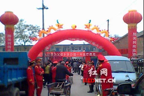 非常隆重,標語有:某某個人為父老鄉(xiāng)親辦理一年醫(yī)療費用……