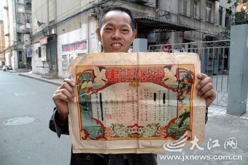 昨日,家住南昌市郵電小區(qū)的萬先生向記者展示了一張1943年的結婚證。據(jù)萬先生介紹,他是一名搬運工人,一個月前,他在廢紙堆里發(fā)現(xiàn)這件稀罕物。