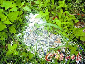 昨日,記者來(lái)到東城區(qū)溫塘村文塔路,在墓地走了一圈,發(fā)現(xiàn)這個(gè)地方大約有300多平方米,后面是一片竹林,小山頭上雜草眾生,周?chē)袔讞潬尾樓,不遠(yuǎn)處有幾間小廠(chǎng)。即使是中午時(shí)分,也很少有人經(jīng)過(guò),因7日晚上突然下起大雨,一些未收拾干凈的骨灰聚集在一起,隨著雨水貼在草地上,與重陽(yáng)節(jié)當(dāng)?shù)卮迕窦雷鏁r(shí)留下的鞭炮碎紙片交融在一起。
