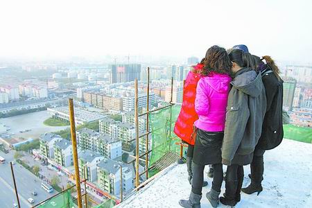 昨日下午3時(shí),記者趕到航海路與未來路交叉口附近的中鼎翡翠2期公園壹號(hào)樓盤。記者上到25層樓頂,看到6名女子正站在西側(cè)沒有任何防護(hù)設(shè)施的邊緣。聞?dòng)嵹s到的管城消防大隊(duì)一中隊(duì)消防員和航海路派出所民警已經(jīng)趕到現(xiàn)場,對欲跳樓的6名女子進(jìn)行勸說。由于風(fēng)大很冷,記者注意到這些售樓小姐相互之間聚得很緊。