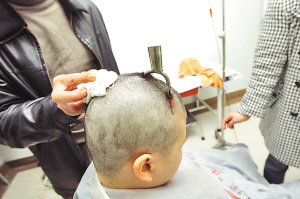 袁正敏被送到醫(yī)院后剃光頭發(fā),等待手術(shù)。