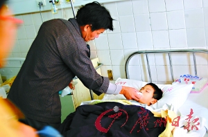 昨天中午12時(shí)30分,在汕頭市中心醫(yī)院住院B樓兒科病房17號(hào)床前,站著一個(gè)中年男子,他叫高貴增。高貴增身穿一件較舊的深色麻布衣服,腳踩一雙磨損的藍(lán)色人字拖鞋,亂蓬蓬的頭發(fā)下是一張擠滿皺紋的黑瘦臉龐。他表情木訥地站在不大的病房里,看著病床上躺著的9歲兒子小海(化名),孩子鼻孔里塞著氧氣管,在病床上已經(jīng)躺了6天。