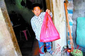 小海平日和父親睡在一張舊式板床上。床板光禿禿的,沒有草席,也沒有墊子。這間潮汕老屋里沒有一件像樣的家具用品。臥室的屋頂早已破舊,陽光從上面的兩個方孔斜射下來,照在床邊。奶奶說,家中最新的東西,就是那部固定電話,不過現(xiàn)在已經(jīng)停機(jī)了。記者在屋里發(fā)現(xiàn)了小海的“書包”。其實根本稱不上是書包,而是一個紅色的透明薄膜塑料袋。里面裝著幾本破舊的書,還有一沓試卷。