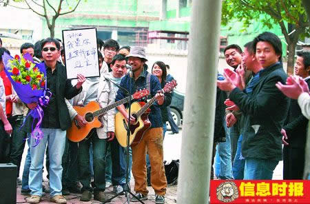 一名男子手持玫瑰花、高舉求愛宣言,并邀來樂隊助陣高唱情歌。昨日上午,珠江新城華利路附近某小區(qū)門口的新奇場面引來眾人圍觀。求愛男子自稱是在網上看到女主角所在單位為其做的征婚廣告,專程從哈爾濱趕來,并想出這個主意以期望感動對方。圍觀者紛紛質疑這場“求愛秀”是商業(yè)單位的宣傳炒作。