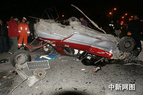 轎車(chē)一側(cè)停放著一輛中型貨車(chē),駕駛室受損較輕,前擋風(fēng)玻璃已經(jīng)破碎。距離轎車(chē)西面30多米處,一輛出租車(chē)停在馬路中間的護(hù)欄旁,出租車(chē)已經(jīng)被撞的支離破碎,車(chē)底朝天,兩個(gè)后輪胎掉在地上,地上撒滿(mǎn)了汽油。馬路中間一根護(hù)欄上的水泥墩由于受到巨大的撞擊力,也被“連根拔起”,出租車(chē)內(nèi)一男子駕駛員被壓在車(chē)底,無(wú)生命跡象。