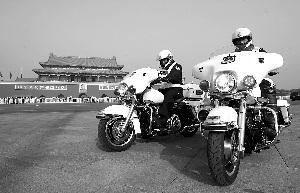 昨日上午,交警駕駛最新裝備的哈雷摩托車在天安門廣場發(fā)車開始首日執(zhí)勤。記者 張濤 攝