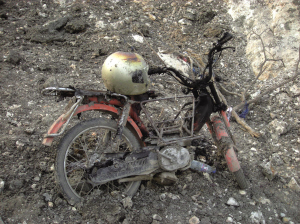 發(fā)生爆炸的大坑附近,還有一輛被燒焦的摩托車,車上還有一頂被燒糊的駕駛員頭盔。