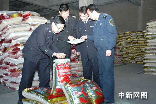 喀什海關(guān)查驗(yàn)和緝私關(guān)、警員對(duì)查獲的走私出口大米進(jìn)行核對(duì)。(孫濤 攝)