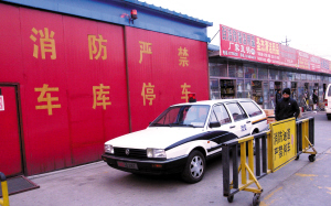 ?吭诔(yáng)東郊市場(chǎng)內(nèi)消防車(chē)庫(kù)門(mén)前的“山寨警車(chē)”。晨報(bào)記者 蔡代征/攝