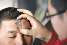 文在哪呢?他想也沒(méi)想,指向了腦門(mén)。過(guò)了30分鐘,一個(gè)鏤空的、深藍(lán)色的“窮”字就出現(xiàn)他的腦門(mén)上了,這個(gè)字花了他30元錢(qián)。