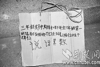 在桌子上,記者看到一塊黃色紙牌,上面寫著:“三年級期中、期末如果不考全年級第一的話,就到學校門口去站著!(如圖)。