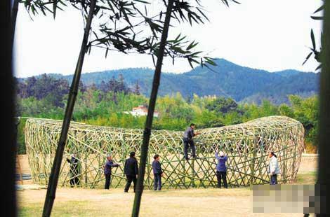 杭州雙溪景區(qū)的村民仿照奧運(yùn)鳥(niǎo)巢的造型,用了800根竹子,10多個(gè)人經(jīng)過(guò)15天的手工編制,以20比1的比例制作出“竹鳥(niǎo)巢”,并將它作為當(dāng)?shù)剜l(xiāng)村運(yùn)動(dòng)會(huì)的會(huì)場(chǎng),開(kāi)展沙灘排球、弓箭狩獵、滾鐵圈等項(xiàng)目。(7月29日《天府早報(bào)》)