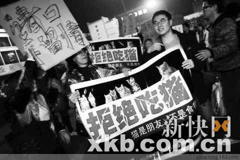 在廣場(chǎng)上,一見“聞貓即興”等人出來了,其他人都著急地圍上去詢問。盡管結(jié)果不是太讓人滿意,但大伙還是決定在廣場(chǎng)上舉行一次小型的抗議活動(dòng)。100多人圍在一起,高舉著“請(qǐng)發(fā)揚(yáng)人道主義,放過它們”、“請(qǐng)口下留情”、“拒吃貓肉”等紙牌,喊著口號(hào)。并有細(xì)心的網(wǎng)友拿著印制好的傳單,向候車的乘客宣傳“不吃貓肉”。對(duì)此,路人大都報(bào)以一笑。