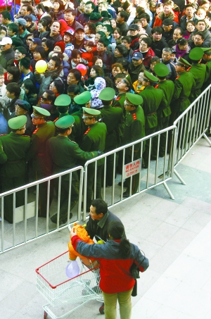 “新店開張,油、米、面、肉低價促銷,還發(fā)券,能不吸引人嗎?”李先生說,昨日上午9時許,他原準(zhǔn)備趕在超市剛開門就進去轉(zhuǎn)轉(zhuǎn)。但一到萬達廣場,只見家樂福門口聚集著大量顧客,數(shù)百人的隊伍早就排至數(shù)十米外,并還在不斷膨脹。為維持秩序,工作人員在隊伍兩側(cè)安置了簡易護欄,同時,數(shù)十名武警一字站開,引導(dǎo)眾人進入超市。