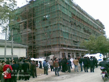 位于奉賢區(qū)金匯鎮(zhèn)金錢公路2225號的一在建6層樓房坍塌,8名工人被埋。(圖片來源:東方網(wǎng))