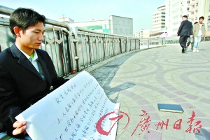 聲稱要“賣腎創(chuàng)業(yè)”的男子手持“自白書”坐在天橋上。記者王子恒 攝