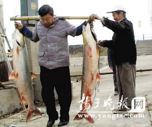 昨天上午,老胡請來漁民用魚網(wǎng)對5年來從未捕撈的魚塘進行捕撈。魚網(wǎng)撒下去不到兩分鐘,就從水面上傳來嘩啦啦的水浪。岸上人一看,只見水中的魚網(wǎng)被水下白色物體咬住了,大家一起拉網(wǎng),網(wǎng)下掀起層層的水花,兩條漁船迅速合并,幾名漁民聯(lián)手協(xié)力,用了半個小時,才將魚網(wǎng)拽住。這時,兩條一米多長的大魚一番折騰后耗盡了力氣,全身纏著魚網(wǎng),露出了發(fā)白的肚皮。