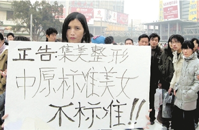 “人為地給美女定下標(biāo)準(zhǔn),是對(duì)中原女性的不尊重!弊蛉障挛,二七塔下,一名身材高挑、披肩長(zhǎng)發(fā)、顴骨高凸、細(xì)看還有喉結(jié)貌似女人的男子舉著一塊牌子,牌子上寫著:正告集美整形,中原標(biāo)準(zhǔn)美女不標(biāo)準(zhǔn)!這名男子不時(shí)用雙手將牌子舉過頭頂,引得周圍的人們指指點(diǎn)點(diǎn)。