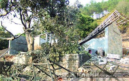 發(fā)生爆炸的私炮點(diǎn)位于譚禮村新寧隊(duì)后面的一個(gè)山坡上,民房離那里最近的只有約20米。在五六間磚木結(jié)構(gòu)的房子旁,一塊約100平方米的地面已漆黑一片,私炮點(diǎn)四周用水泥砌成的矮墻已全部崩塌,現(xiàn)場(chǎng)一片狼藉。