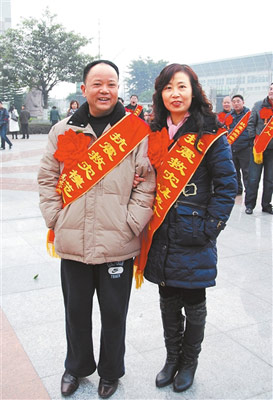 在什邡市政府研究室副主任廖曉軍的相機(jī)里,有一張劉慶祿夫妻披著抗震救災(zāi)模范綬帶的照片。廖曉軍說,去年12月30日,市委、市政府召開抗震救災(zāi)表彰大會(huì),辦公室通知?jiǎng)c祿參會(huì)時(shí),他說自己正在值班,要去幾個(gè)受災(zāi)鎮(zhèn)發(fā)放過冬物資,就不參加了。因?yàn)樗鳛槟7秱(gè)人代表不能缺席,于是就一再通知他務(wù)必到會(huì)。最后,他來不及回家換件衣服,就直接從倉(cāng)庫(kù)趕到大會(huì)現(xiàn)場(chǎng)。也在這里,留下了生前最后的影像,也是和妻子的最后合影。