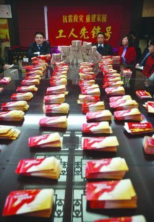將近三百萬元現(xiàn)金堆在桌子上,看起來有點(diǎn)“夸張”,但它們在即將要送的紅包中,只占現(xiàn)金量的十分之一左右!這次去災(zāi)區(qū),陳光標(biāo)與63位企業(yè)家捐贈與籌集的現(xiàn)金總額約3000萬元,另外還有大米、豬肉、食用油、羽絨服、毛衣等物資,價值3000多萬元。其中,陳光標(biāo)的黃埔再生資源利用有限公司捐贈現(xiàn)金300萬元。