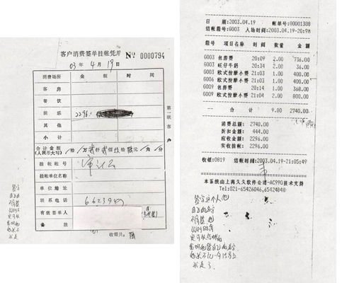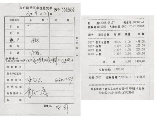 結賬小票上列明的服務包括貴賓包房費、鐘費、加鐘、小費、飲料等。第一次消費的時間為2003年4月19日,入場時間為晚8點09分,結賬時間為晚9點05分?傁M金額為2296元。其中,包房共計3間,費用為1104元(368×3);歐式按摩小費共有3筆,其中兩筆分別為400元,另一筆則標明數量為2,金額為800元。另一份賬單的時間為2003年9月27日,入場時間為晚上8點03分,結賬時間為晚9點10分?傁M金額為1498元。其中“貴賓包房費”是498元,鐘費是200元,加鐘是200元,小費是600元。