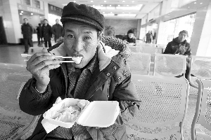 昨天11:00,記者來到中央門汽車站,站前廣場上空無一人。前天還像煮餃子一樣的候車大廳,只有稀稀拉拉的幾十個(gè)人。下午3:20左右,車站端出了為旅客精心準(zhǔn)備的“年夜飯”:一鍋餃子,共40碗分盛給站內(nèi)的每一位旅客。一位前往南通的老漢邊吃邊笑呵呵地說:“好吃,真好吃!15:40,隨著南京到南通的最后一班車徐徐駛出,車站歸于了平靜。年前的春運(yùn)就這樣順利落幕了,沒有一名旅客滯留在車站。車站人士介紹,昨天一天的客流量約在5000人次,僅是24日的1/12。