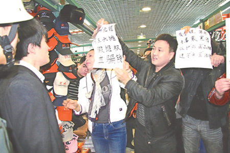 2月8日上午9點半,北京秀水街市場有限公司依據(jù)北京英特普羅知識產(chǎn)權(quán)代理有限公司向其提供的一份公證書,以涉嫌售假為名,準備對市場內(nèi)的7家商戶進行封攤處罰。但在場商戶卻手持公證處的一份“證明”,強烈質(zhì)疑英特普羅代理公司出具的售假公證存在“證據(jù)不足”,并與市場管理人員和保安發(fā)生沖突。