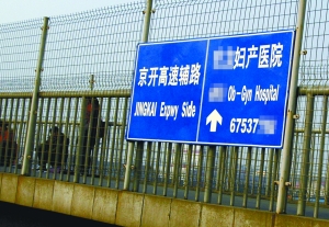時(shí)先生所指的指路牌有四塊。其中一塊懸掛在新發(fā)地長(zhǎng)途客運(yùn)站門前的過(guò)街天橋南側(cè)護(hù)欄上,正下方為進(jìn)京方向輔路。這塊藍(lán)底白字的牌子上,并排印著京開(kāi)高速輔路和某家婦產(chǎn)醫(yī)院的字樣,旁邊還有相應(yīng)的英文和箭頭指明方向,并留有醫(yī)院電話。