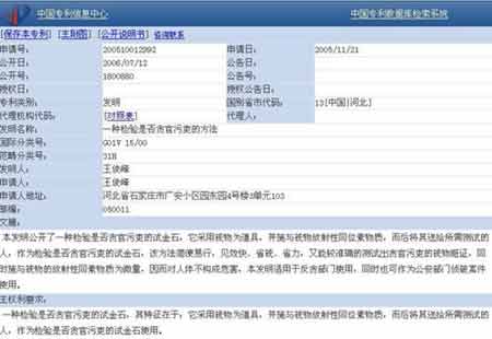 隨后,信息時(shí)報(bào)記者登上了中國(guó)專利信息中心這個(gè)國(guó)家知識(shí)產(chǎn)權(quán)局直屬單位的網(wǎng)站,根據(jù)網(wǎng)友“呂輕侯”提供的截圖和信息,在中國(guó)專利信息中心的專利數(shù)據(jù)庫(kù)檢索系統(tǒng)仲搜到了這份申請(qǐng)(專利)號(hào)為200510012992.0的申請(qǐng)公開(kāi)說(shuō)明書(shū)。申請(qǐng)(專利權(quán))人和發(fā)明人是一個(gè)家住河北省石家莊市,名叫王俊峰的人。提出申請(qǐng)的日期是2005年的11月21日,而該發(fā)明的全稱為“一個(gè)檢驗(yàn)是否貪官污吏的方法”。