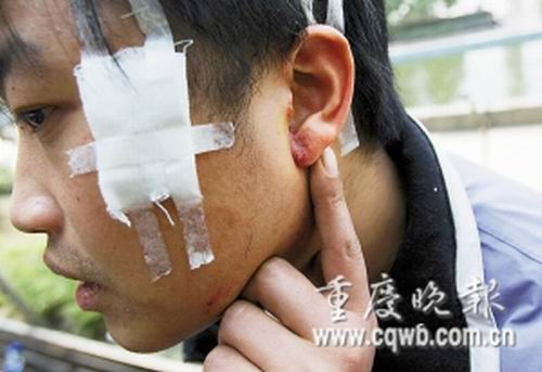 小販夜市擺攤,城管隊(duì)員去阻止,引發(fā)雙方打斗。打斗中,小販一棒擊中城管隊(duì)員腰部,而城管隊(duì)員一口咬破小販耳垂!叭湫小卑l(fā)生在九龍坡區(qū)黃桷坪,昨日,小販李利捂著耳朵去找對方理論。