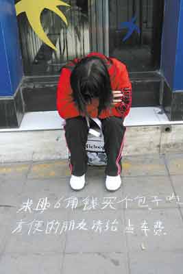 “我叫王欣(音)”乞討的90后小聲地告訴記者她今年12歲。記者拿出一元錢(qián)給她,提出陪她去買(mǎi)包子,可王欣并不愿意走。一個(gè)路過(guò)的大爺告訴記者,這個(gè)小女孩每天都在換地方。就在這時(shí),王欣收起紙板匆匆離開(kāi)。2月10日,記者意外在大黃路口發(fā)現(xiàn)王欣,這次她用粉筆在地上寫(xiě)的是“乞討6角錢(qián)買(mǎi)個(gè)包子吃,如果方便再給點(diǎn)車(chē)費(fèi)”。
