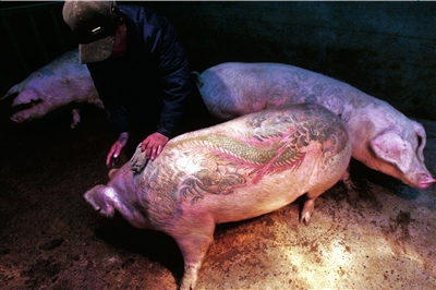 記者看到,還有9頭文身豬在寬敞明亮的豬圈中,而原來一起長大的3個同伴都準(zhǔn)備前往歐洲,并被賣出了70萬到100萬元人民幣的高價。9頭豬都是母豬,剛滿周歲。“因為母豬更耐痛,文身更方便!憋曫B(yǎng)員潘師傅說。見到生人進到豬圈,豬開始不安分地嗷嗷叫。這幾頭豬的體重都在400斤以上,長得極為肥碩。它們身上都文有精美的圖案!斑@頭文著龍紋標(biāo)志的豬就叫大龍,文著美人魚的就叫美人魚,它們的名字都是根據(jù)花紋取名的!逼渌i身上文著宗教畫、中國年畫和卡通圖。