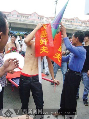 據(jù)了解,這支迎親隊(duì)伍當(dāng)日中午從大沙田出發(fā),沿著星光大道、白沙大道,走上葫蘆鼎大橋,最后到達(dá)目的地竹溪大道某飯店。迎親隊(duì)伍在行進(jìn)途中十分引人關(guān)注,不少市民拿出相機(jī)、手機(jī)拍照?赡苁怯X得不好意思,新娘悄悄把身后的“我是淫婦”取下,用手中的鮮花擋住。到達(dá)目的地后,新郎大呼一聲:“其實(shí)我不是奸夫!”接著脫掉綠帽、紅綢,將新娘背進(jìn)飯店。記者注意到,此時的新郎身上已經(jīng)留下了幾道被竹條抽打的痕跡。