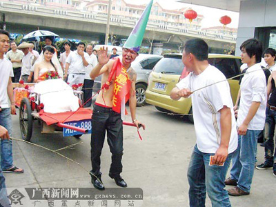 兩位新人的老鄉(xiāng)趙先生參與策劃了這次接親活動!斑@樣惡搞其實(shí)就是圖個熱鬧!”趙先生告訴記者,在老家邵陽,每家人迎親時都要大鬧一番,形式不限,花樣翻新,越熱鬧越好,“有句話叫‘結(jié)婚三日無大小’,說的便是結(jié)婚那幾天不必計(jì)較輩分,誰都可以拿來惡搞。因此,新郎的父親也被拉進(jìn)迎親隊(duì)伍,甚至遭到‘鞭打’。而新郎在迎親當(dāng)天一定要吃夠苦頭,有車不能坐,要拉著新娘走,被鞭打更是家常便飯”。