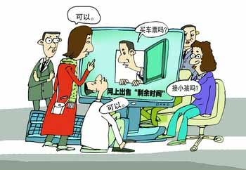 在搜索引擎百度上輸入“出售剩余時間”,可得到相關(guān)網(wǎng)頁400多萬篇,“出售時間”生意的火爆可見一斑!澳阆敫墒裁次襾韼湍阃瓿,給你節(jié)約時間,用我的時間來給你辦事,然后你支付一定的費用,這就是‘出售剩余時間’!本W(wǎng)友劉女士在廣告上如此解釋“出售剩余時間”。