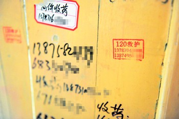 記者還在該院男、女廁所的門板、瓷磚、水管等處看到遍布的“救護車接送病人”、“出院用車”、“包車”、“病人接送車”、“120救護”等不同字樣的廣告標(biāo)貼,上面的所有電話都是私人手機號碼,個別廣告標(biāo)貼上甚至還配上了車輛圖片,顯得“很真實”。