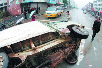 接讀者報(bào)料后,記者第一時(shí)間趕到沙市鎮(zhèn)事發(fā)現(xiàn)場(chǎng)。在書院路與建文路的交叉口斑馬線上,側(cè)翻著一輛小貨車。盡管一直下著毛毛細(xì)雨,但小貨車駕駛室窗口邊一米長(zhǎng)的血跡還明晰可見。當(dāng)?shù)鼐用裰阜Q肇事車是瀏陽市交通局沙市交管站的執(zhí)法車,停在10多米遠(yuǎn)的地方,牌號(hào)是湘A8F905,執(zhí)法車左側(cè)中間有被撞的印跡,車頭對(duì)著倒地的小貨車。