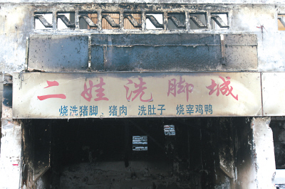 昨日,記者在九坑子農(nóng)貿(mào)市場(chǎng)中找到了這家“最牛洗腳城”,由于該地段即將拆遷,該店鋪內(nèi)早已空無一人,但“二娃洗腳城”的招牌依然高掛在這家僅10平米大小的店門前,在這片凌亂的地方,顯得十分醒目。