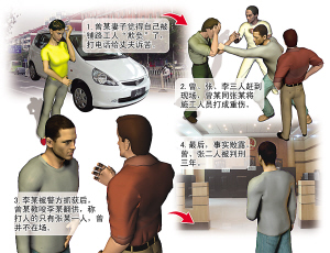 檢察官劉毅稱,當(dāng)時(shí)李某是開車去的,被圍觀群眾記下了車牌號(hào),警方據(jù)此將他抓獲。曾、張二人得知李某被抓,商量由張某獨(dú)自扛下此事,并統(tǒng)一口徑“曾某不在打人現(xiàn)場(chǎng),只有張一人動(dòng)了手!