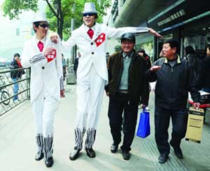 提起這兩個小伙子,南京市民可能并不陌生。2米26的那個叫張夢永,2米12的叫秦為超,快報曾經(jīng)報道過他倆的“雙塔組合”。昨天下午兩點(diǎn),兩“巨人”出現(xiàn)在山西路上,穿著定制的白色禮服,戴著高高的白色禮帽,再配上酷酷的墨鏡,所經(jīng)之處立刻被圍得水泄不通。“哇,你有姚明高么?”“你們的腿是真的假的啊?”“這么大腳,是真的么?”圍觀的市民們提出千奇百怪的問題,兩個小伙子耐心地一一解答。