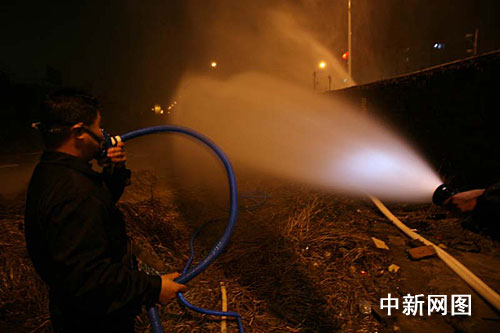 晚上七時(shí)許,記者趕到事故現(xiàn)場(chǎng),空氣中彌漫著難聞的煤氣味。為防止意外,泄漏點(diǎn)江北大道前后500米已被交警部門(mén)拉起長(zhǎng)長(zhǎng)的警戒帶。由于封道,警戒線(xiàn)外汽車(chē)排起了長(zhǎng)龍,一眼看不到底,圍觀(guān)者眾多,整條環(huán)城北路幾乎癱瘓,十幾名交警正在現(xiàn)場(chǎng)指揮疏散。而在警戒帶內(nèi)200米,消防部門(mén)正在下風(fēng)方向設(shè)置了三道水幕水帶,對(duì)泄漏的煤氣進(jìn)行稀釋。