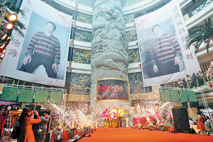 昨日上午11時(shí),渝北照母山龍湖東海酒樓,五層樓房被禮炮和彩色氣球包裹,兩幅10多米長(zhǎng)的巨幅海報(bào)從五樓垂到底樓,私家車在酒樓前的馬路上綿延停放了數(shù)百米。除了喜慶的管弦樂(lè)隊(duì)演奏外,印有“祝劉梁先生生日快樂(lè)”字樣的滑翔機(jī),也在酒樓上空不斷盤旋。