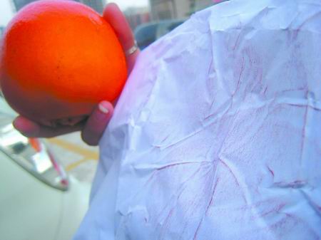“網(wǎng)友們說(shuō),有些商販為了讓橙子色澤更漂亮、賣相更好,就把色素注射到橙子皮里,再在皮上打些石蠟,使橙子看起來(lái)很新鮮,但這樣的橙子會(huì)‘掉色’!痹S女士說(shuō),她用紙蘸了些水,在還沒(méi)食用的橙子上擦拭,“紙變成紅的了,我又用手去擠剝下來(lái)的橙子皮,流出來(lái)的水也是紅的!