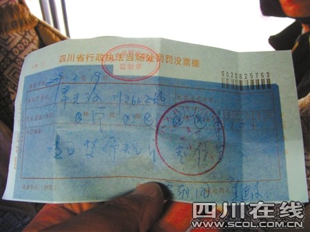 19日上午10時許,仁壽縣城區(qū)書院街,倪師傅正騎著新買的三輪車。一輛沒有牌照的長安之星警車,突然停在他面前,從車上下來兩個身著交警協(xié)警員制服的男子:“你的車不能進城,過來接受處理!蹦邘煾到忉屨f:“警官,我是來給車上牌照的,交警大隊在城里,我必須進城啊!薄吧僬f這些,違反了規(guī)定就要罰款。本來罰200元,念你是初犯,交100元就是了!彪S即,坐在該車駕駛室里的一名身著交警制服的中年男子開了一張100元的罰款單據(jù),倪師傅最終只得無奈地交了罰款。