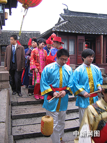 今天一早,古鎮(zhèn)周莊已是人頭攢動(dòng),張廳、沈廳張燈結(jié)彩。良辰吉時(shí)一到,長衫、馬褂、禮帽打扮的新郎駕著鑼鼓震天的迎親船由水路駛來,吸引著河兩岸的游人來回奔走爭睹。隨后紅蓋遮面、身著花衣花衫、足蹬繡花鞋的新娘出閣、上花船、搖快船、拜堂、鬧洞房、走三橋、喝喜茶、夫唱婦隨“雙推磨”……熱鬧的水鄉(xiāng)婚禮吸引了無數(shù)游人擠身觀賞,小情侶們更是眼紅心讒。