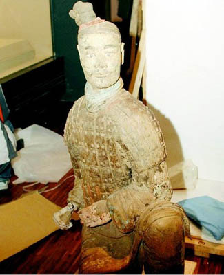 據(jù)陜西歷史博物館館長成建正介紹,這件綠面跪射俑即使在兵馬俑博物館也僅展出過一次,平時都是用布將兵馬俑包裹起來的。該俑是考古隊在1999年9月10日在二號坑發(fā)現(xiàn)的。整個兵馬俑身上都施以彩繪,尤其是面部彩繪完整,白色眼白,黑色瞳孔,雙眼炯炯有神。不同于其他陶俑的淡粉面色,淡綠面色尤其引人注目。該俑的出土,引起了文物專家的爭論,誰也不能確定為什么這尊俑的面部要施以綠色顏料,甚至有人猜測“綠面”有可能是工匠們的惡作劇。