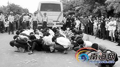 兩名沙場老板因經(jīng)營利益問題產(chǎn)生糾紛,雙方各組織幾十人乘3輛大卡車持長粉槍、長勾刀等兇器欲進行火拼。臨高警方得到消息后迅速組織160警力、20余輛警車圍追堵截,成功制止了一起聚眾斗毆事件,避免了流血事件發(fā)生。此次行動,臨高警方共查扣違法車輛6部,抓獲涉嫌持械斗毆嫌疑人58名。其中43人被刑拘、12人被行政拘留、3人待查。