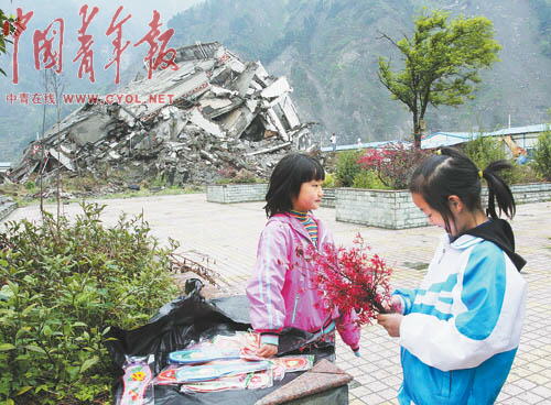 這里是映秀鎮(zhèn)“5·12特大地震”遇難者公墓,安放著數(shù)千名地震遇難者的遺體,清明前的這個周末,不少遇難者家屬紛紛前來祭掃親人。山下,賣香燭紙錢的攤點上放著的一張張地震照片讓不少人暫時停下腳步。有的照片還被做成書簽,旁邊配上自己填的詞:“憶秦娥,5·12震中,二00八年五月。西風(fēng)烈,震龍沖出火五月;鹞逶拢承泐澏!廢墟聲裂......”從城里趕回來“看”父親的彭瑞,正在仔細(xì)地端詳著照片!鞍职志褪窃谶@里遇難的!彼钢掌系膹U墟說。地震時,他在附近的漩口中學(xué)上高三,如今他已是成都一所大學(xué)的大學(xué)生。除了照片,攤點上還放著關(guān)于地震的CD光碟。守攤的小姑娘介紹,這些都是從鎮(zhèn)里的集市上批發(fā)來的,光碟里主要是當(dāng)?shù)仉娨暸_播放的地震后搶救學(xué)生的報道!坝行┩尥匏赖煤脩K啊,連我爸爸看后都哭了!彼f。