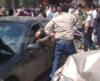 記者在附近找到了不少目擊現(xiàn)場的群眾,大家均表示在車禍發(fā)生后聽到了兩聲巨響!笆掳l(fā)時大概在下午1點45左右,一輛銀灰色夏利車在北辰大道由東向西行駛,到路口時突然有一輛黑色尼桑車以很快的速度迎面沖上去,將銀灰色夏利車撞得轉(zhuǎn)了個向!睋(jù)事發(fā)當(dāng)時在路口值勤的交通協(xié)管員陳先生介紹,黑色夏利車逆行撞上夏利車后,后面追上來的藍色大眾商務(wù)車也避讓不及撞到了黑色尼桑車上。(作者:黃凱 )(昆明信息港)